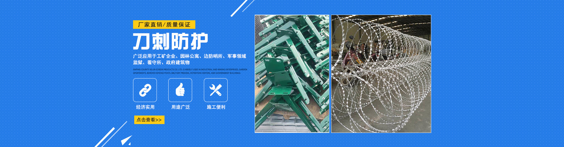 安平初日金屬絲網(wǎng)制品有限公司是一家集生產(chǎn)、深加工、銷(xiāo)售、安裝于一體的絲網(wǎng)生產(chǎn)企業(yè),公司主要產(chǎn)品有刀片刺繩、刺絲滾籠、刺繩支架等多種產(chǎn)品,公司設(shè)備精良,科學(xué)管理,為廣大客戶(hù)提供高質(zhì)量產(chǎn)品,深受客商的信賴(lài)與支持。